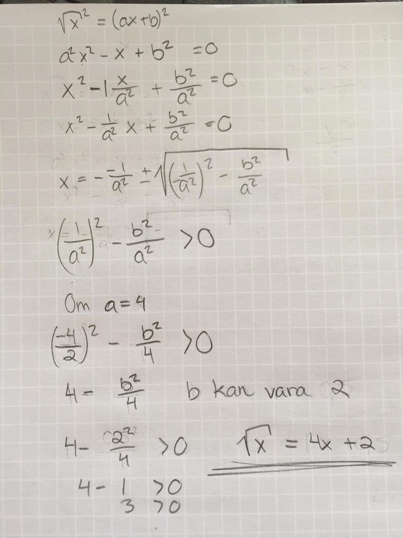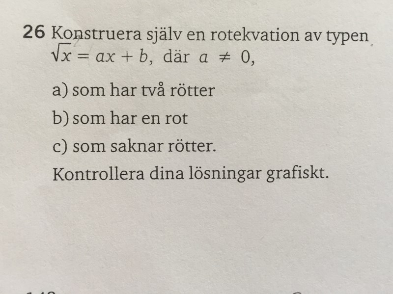 Jag vet hur man löser rotekvationer, kvadrera i båda leden för att sedan använda pq-formeln, men att konstruera de vet jag inte hur man gör. Jag är medveten om att är negativ har funktionen ingen rot, och om det är lika med 0 (tror jag) har den bara en rot. Men hur gör man för att bestämma rotekvationer? Just nu blir det bara att jag testar en massa olika siffror och chansar. Hjälp uppskattas!!