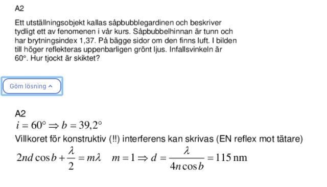 Vad är står på första raden i facit - infallsvinkeln 60o och brytningsindex 1,37 ger brytningsvinkeln 39,2o.