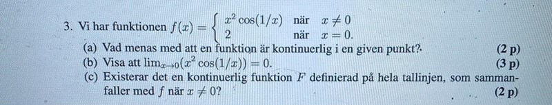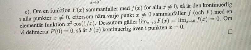 Det skriver de ju - Ja, det existerar en sådan funktion F(x) som är lika med f(x) = x2cos(1/x) om x inte har värdet 0 men har värdet 0 om x = 0. Då har funktionen F(x) samma värde som funktionen f(x) för alla värden utom x = 0, och dessutom mär F(x) kontinuerlig även i punkten x = 0.