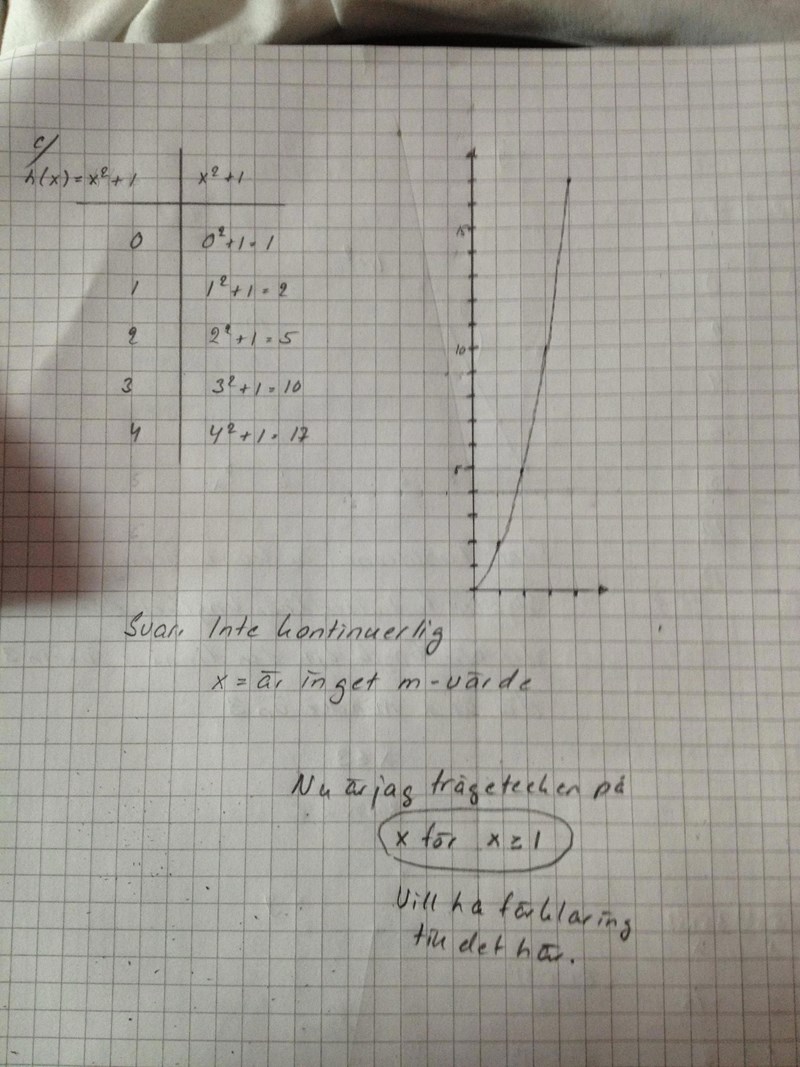 - I c-uppgiften är det ena intervallet . I det intervallet är h(x) definierad som . Rita alltså grafen till i det intervallet, dvs endast för de x som är större än eller lika med 1.