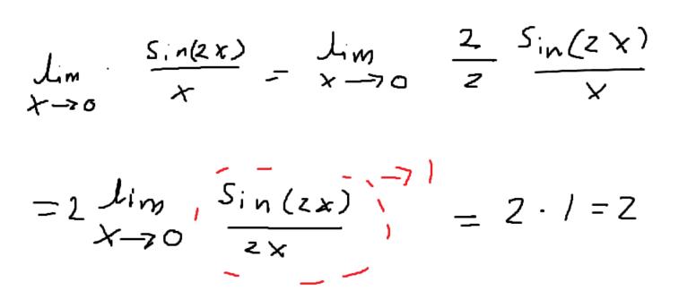Ursäkta, har bara snabbläst, men det står inte att 2 sin(2x) /(2x) = 2 när x = 0.