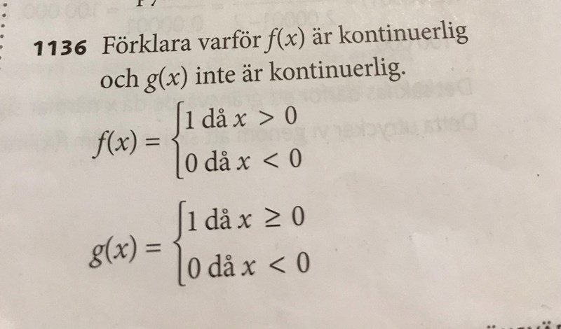 matsC skrev:f har både höger- och vänster- gränsvårde i noll ( i motsatts till g) och om din kurs' defintion av kontinuitet inte kräver likhet så är den kontinuerlig i noll trots att den inte ens är definierad där.