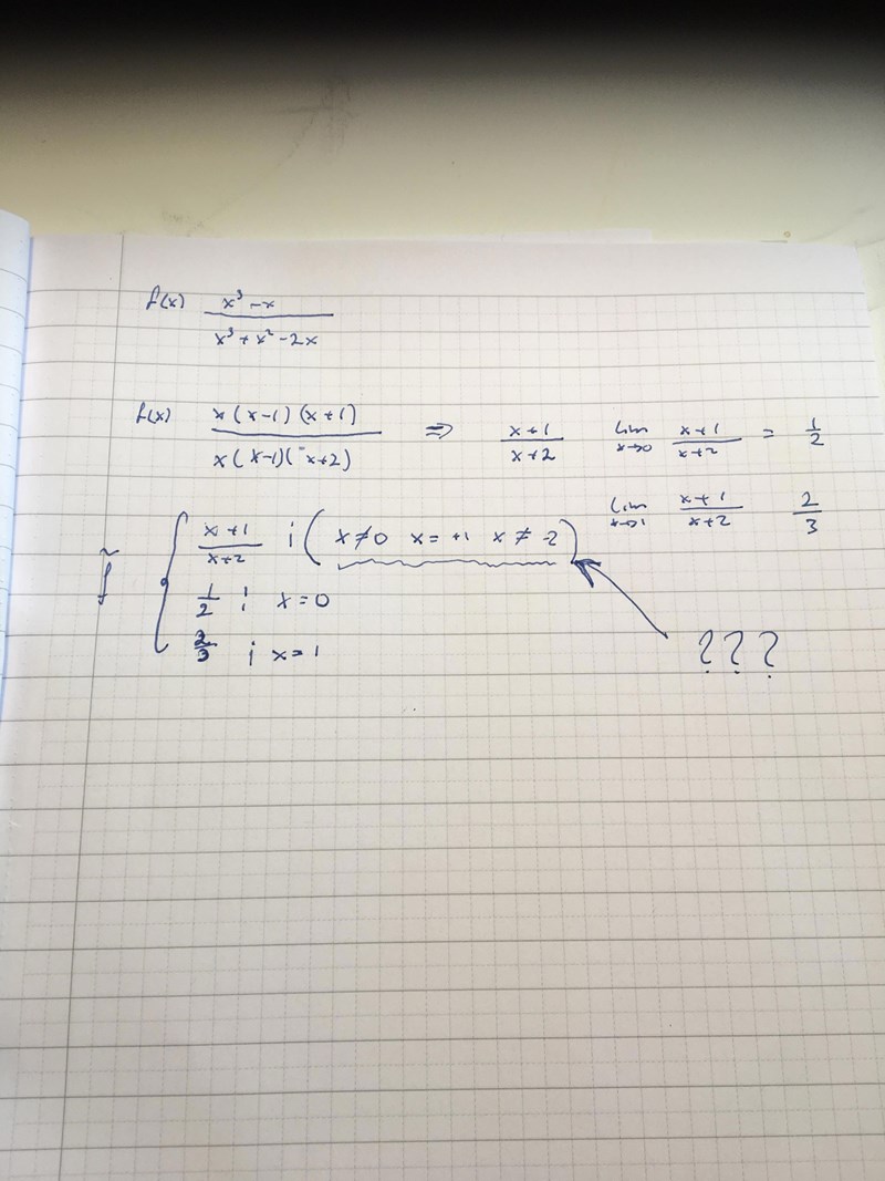 Du har ju fått en funktion som inte är definerad i 3 punkter (eftersom man inte kan dela med 0). Så frågan är om du kan stoppa in något i de punkterna för att få en kontinuerlig funktion. Så det som ska göras är att räkna ut gränsvärdet i alla de punkterna och se om det blir en siffra som man kan fylla igen hålet med. När man räknat lite på det så får fram att det ser ut ungefär såhär: