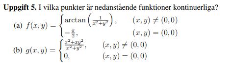 Detta kan ju sedan hänvisas till standardgränsvärde för arctan där vi vet att gränsvärdet går mot . Vilket inte stämmer överens med värdet angivet för punkten (0,0) och alltså är den inte kontinuerlig i (0,0)