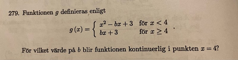 Jag förstår att jag vill få funktionsvärdet i fyran att vara lika med gränsvärdet då x går mot 4 för att funktionen ska bli kontinuerlig, men kan inte gå vidare.