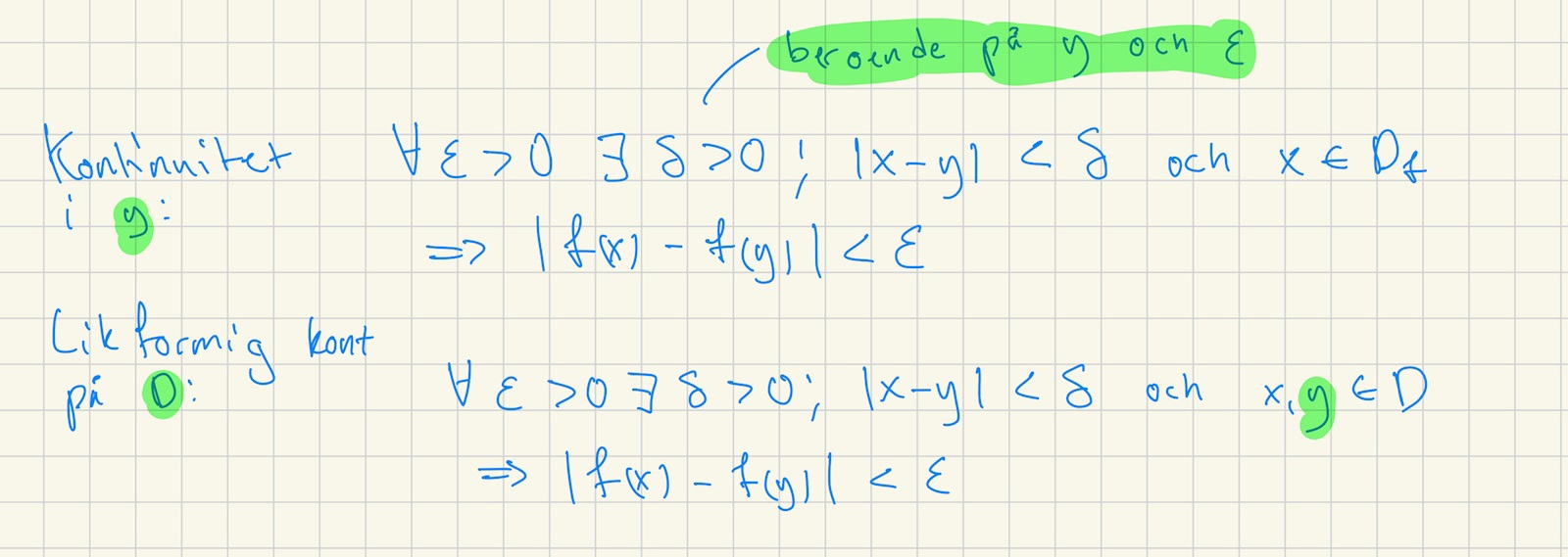 Vi Likformig Kontinuitet: deltat kan väljas enbart beroende på epsilon, dvs oberoende på var i Df man tar gränsvärdet.