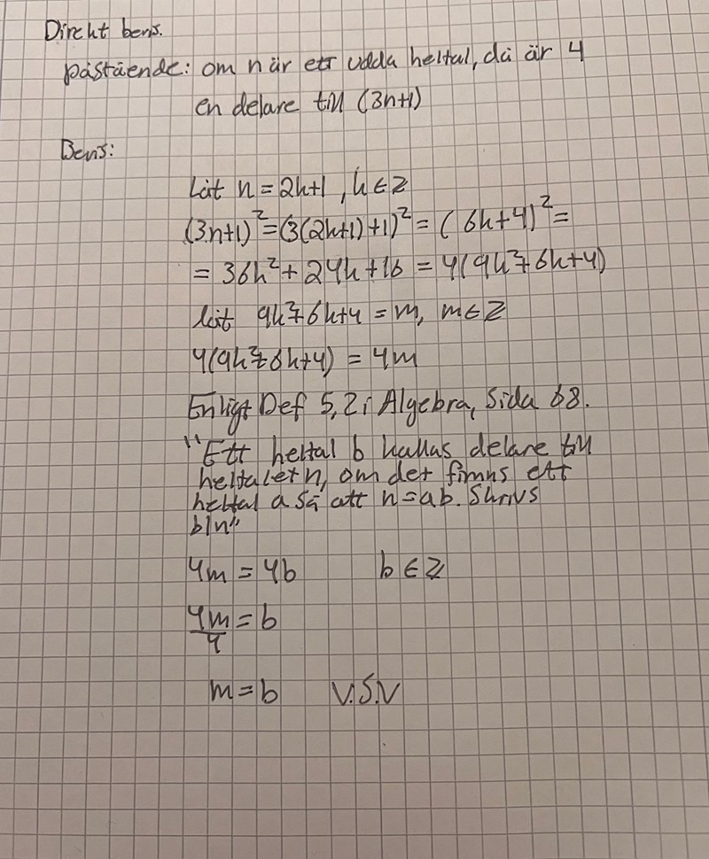 Har fått responsen att jag blandar ihop implikation och ekvivalenspilar. Rättade utifrån min egna kunskap och nu ser beviset ut såhär. Kontroll/feedback kring ekivalens/implikationspilarna nu hade uppskattats enormt!