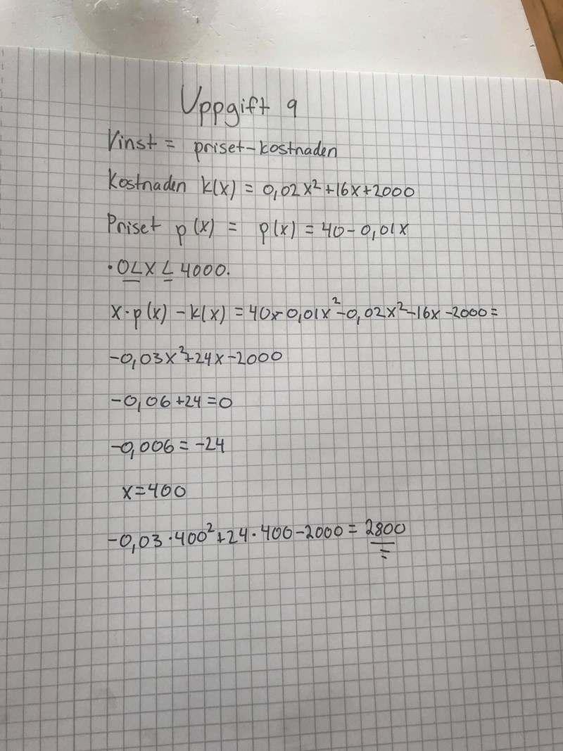 ● Kostnaden, K(x) kr, ges av formeln K(x) = 0,02x^2+ 16x + 2000