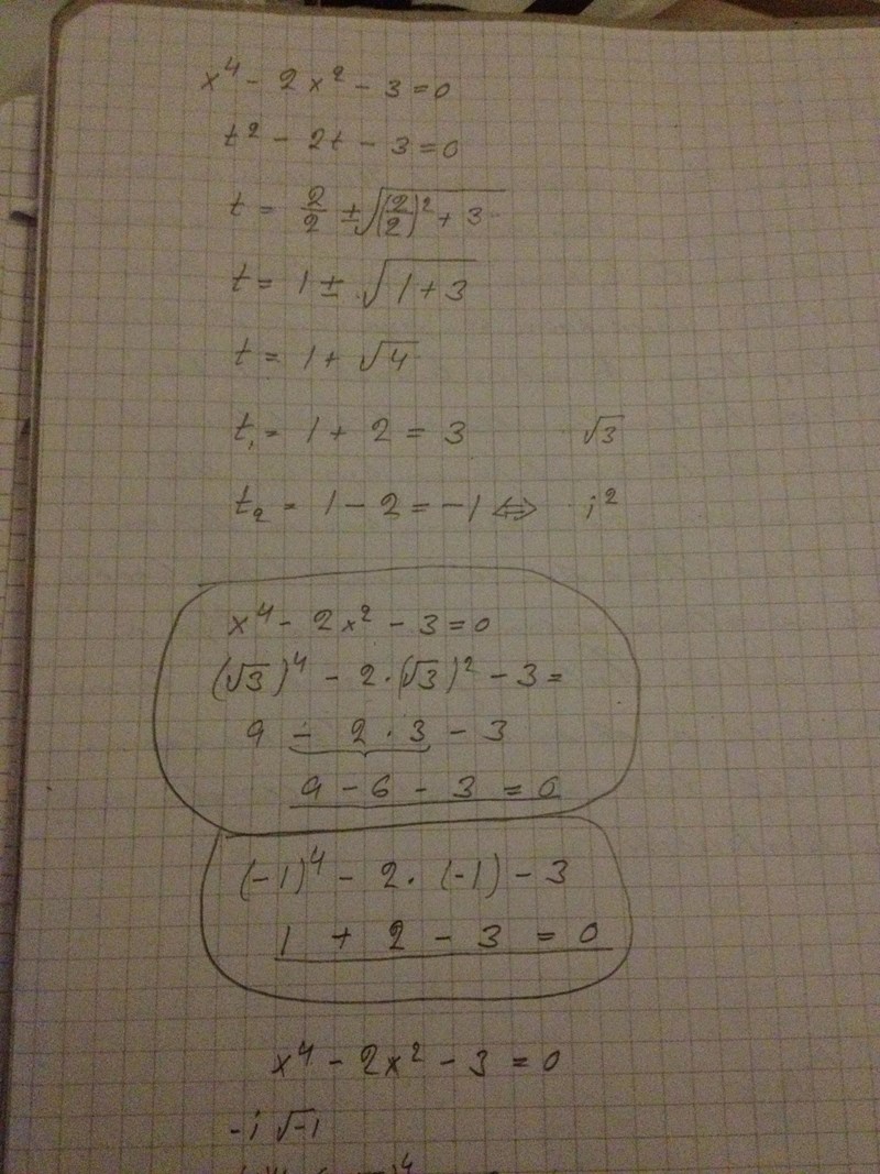 Päivi skrev :Då får jag i fortsättnings vis låta er kontrollera om jag har kontrollerat rätt det här, enbart lösningarna av komplexa tal eftersom svaren i facit finns inte om komplexa tal, när det gäller fjärde grads ekvation. Hur är det med tredje grads ekvation. Finns det där komplexa tal?