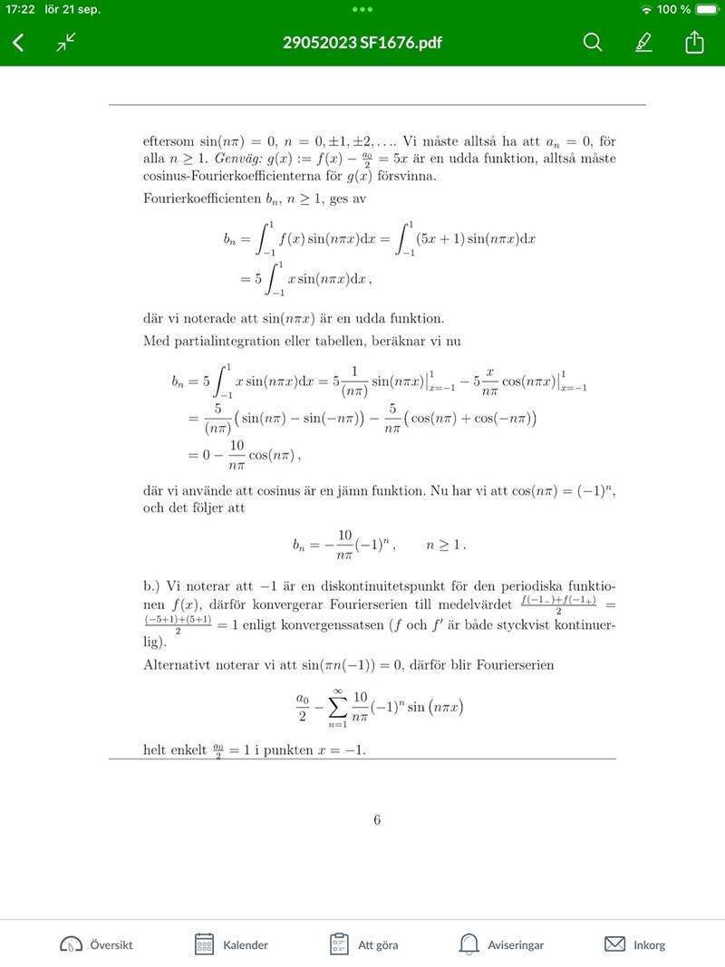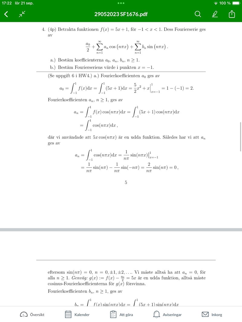 I b) uppgiften frågar man INTE efter funktionens värde i punkten (den är inte ens definierad där), man frågar efter Fourierseriens värde. Och under kursen bör man ha lärt sig att summan konvergerar till (konvergenssatsen)