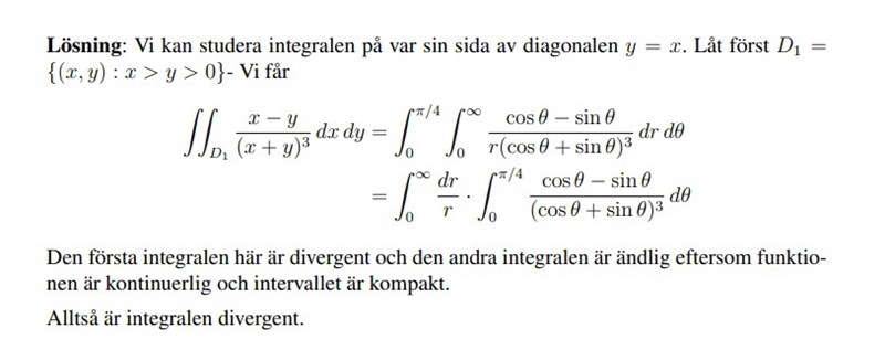Enligt Tonellis teorem kan en dubbelintegral där integranden inte byter tecken delas upp i en itererad integral. Därav lösningen i facit. Eftersom båda de två delintegralerna går mot positiv oändlighet är dubbelintegralen av funktionens absolutbelopp inte finit. Det innebär att en itererad integral av funktionen kan komma att få olika värden beroende på hur man delar upp dubbelintegralen (exempel). Dubbelintegralen konvergerar alltså inte.