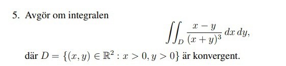 Hej! Jag har en uppgift här angående konvergens/divergens av en dubbelintegral som jag är ganska osäker på. Uppgiften är en ex-tenta uppgift och man får inte ha miniräknare på tentan.