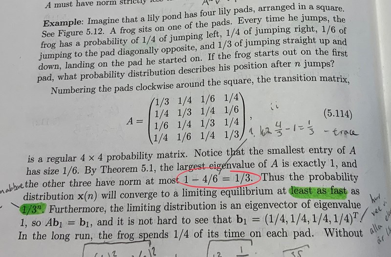 Skulle någon förklara varför den andra största egenvärdet av en sannolikhetsmatris är och därmed konvergenshastigheten av x lika med ?