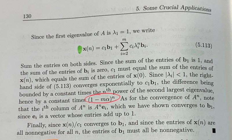 Vi kan tänka oss att vi tar en annan lämplig sannolikhetsmatris , och multiplicerar med denna faktor så att kolonnerna summerar till . Då kan vi skriva . :s egenvärden är inte större än 1 (eftersom det är en sannolikhetsmatris), och egenvärdena till är därför inte större än . Därför är vi garanterade konvergens som långsammast .