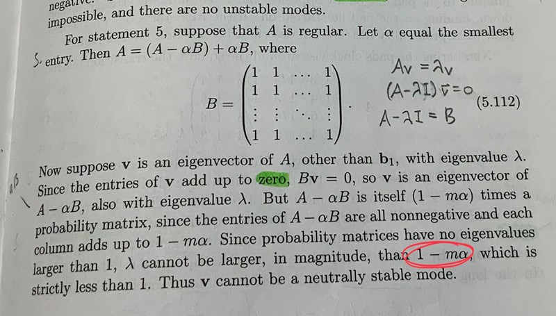 Detta är min tolkning av resonemanget: Eftersom är en sannolikhetsmatris summerar alla kolonner till 1. För att skapa matrisen har vi dragit bort från varje element, och således har totalt dragits från varje kolonn (eftersom ). Kolonnerna i summerar nu till .