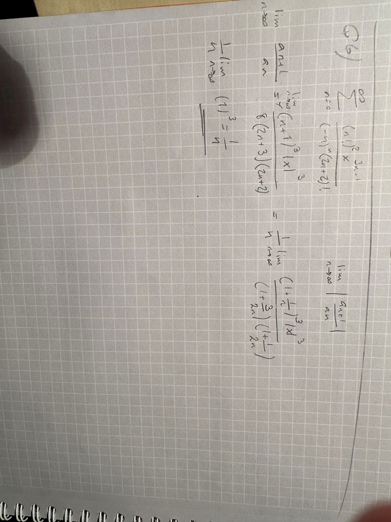 Jag får att den går mot |x3| gånger en konstant, vilket ar ett ändligt tal > 0 för alla x. Så konvergensradien är oändlig.