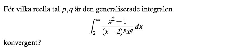 Då har vi oändligheten kvar, och där kommer alla x spela roll. Vi vill att nämnaren ska vara minst en grad högre än täljaren, jämför med 1/x^a där integralen är konvergent mot oändl. om a>1. Det kan vi skriva som p+q>3.