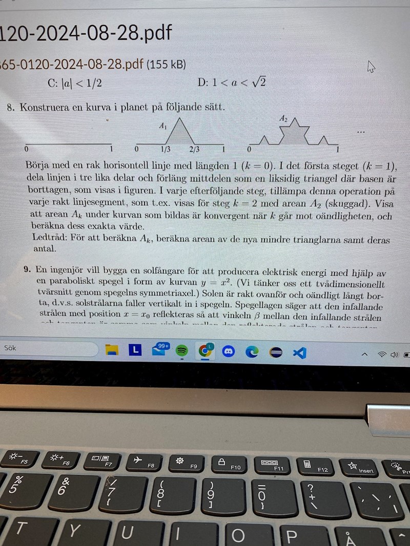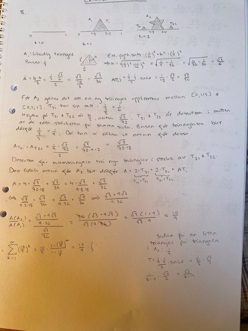 Hej, jag håller på med en uppgift där jag ska visa att en serie är konvergent. Nedan infogar jag bild på frågan samt min lösning. Jag får en divergent summa (kvoten 10/9) men ser inte var jag gör fel. Jag misstänker att det har att göra med de små trianglarna som sitter på den stora triangeln i figur A2. Det finns ingen information om dessa är lika stora som trianglarna som jag har benämnt som T21 och T22. Oavsett har jag testat med det eftersom det står (ledtråd: För att beräkna , beräkna arean av de nya mindre trianglarna samt deras antal). Det kan också ha något med att göra att linjen är borttagen, men jag fattar inte riktigt hur svaret blir annourlunda isåfall.