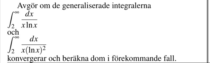 Det är två separata uppgifter. Eftersom du, ifall de är konvergenta, ska beräkna dem, är det generellt sett föga idé’ att göra jämförelsetest. Om någon av dem däremot är divergent, så kan jämförelsetest göra susen för att bevisa det. Ett litet tips i dessa uppgifter: 1/x är derivatan av ln x.