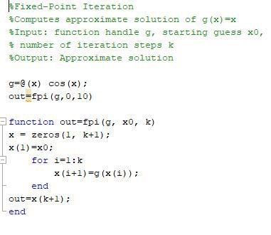 Input till proceduren FixPunktIter är funktionen g, startvärde x0, önskad noggrannhet och Maximalt antal tillåtna iterationer (N).