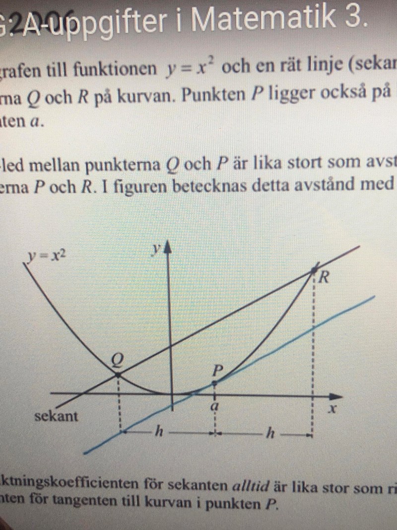 Jag förstår bilden i sig men har ett problem i en uträkning. Men frågan är att sekanten mellan Q och R:s lutning är lika stor som lutningen för tangenten i P.