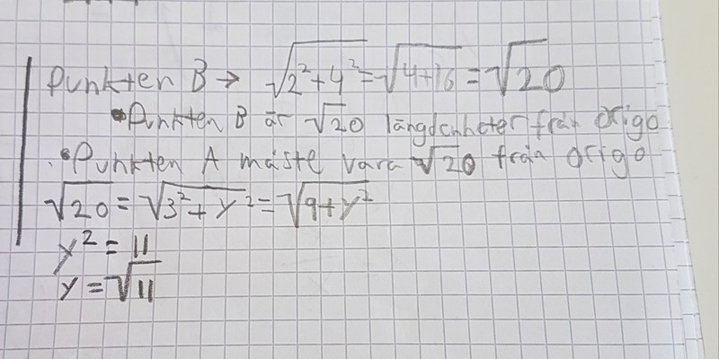Frågan -> "Punkten A ( 3 , y ) har samma avstånd från origo som punkten B (2 , 4 ). Vad är y- koordinaten för punkten A?