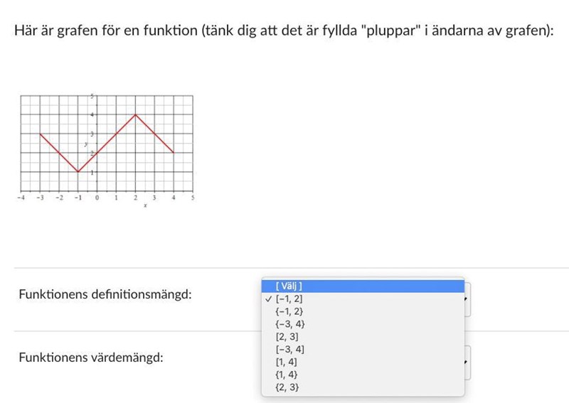 Funktionens värdemängd läser du av utefter y-axeln. De y-koordinater som ligger rakt till vänster/höger om den röda kurvan är värdemängden. Intervallet börjar vid den nedersta punkten på kurvan och slutar vid den översta. Är intervallet slutet eller öppet?