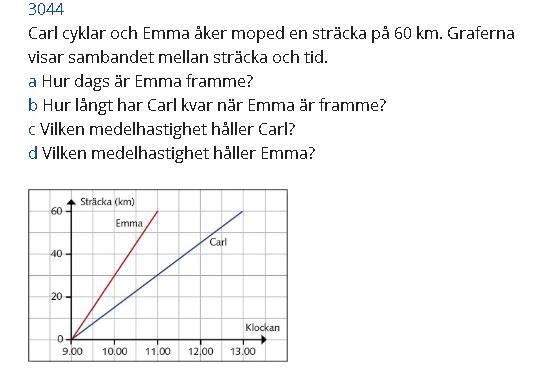 Jag vill veta hur man tar reda på medelhastigheten hos Carl och Emma. Har prövat men finner inga svar.