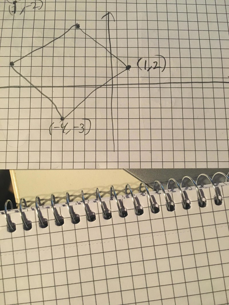 Punkterna med koordinaterna (1,2) och (-4,-3) är två av hörnen i en kvadrat. Vilka koordinater är möjliga för de övriga två hörnen?