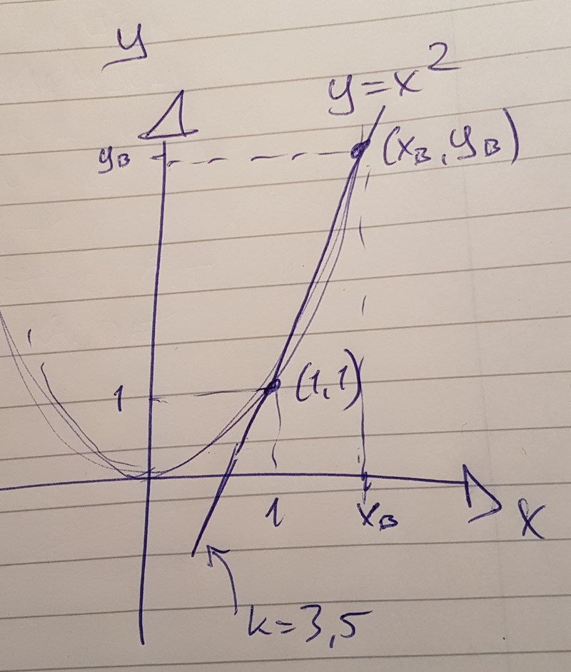 Den där formeln känner jag nog till, men att få det stämma ihop med y= x^2 var nog besvärligare sak om det ska skäras med den och k värdet måste vara 3,5 alltså lutningen. Jag får den inte skära och sedan ska det dras en rät linje mellan två punkter.