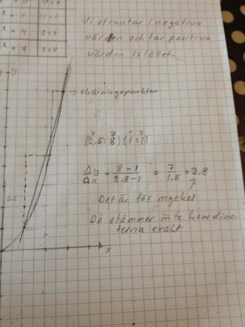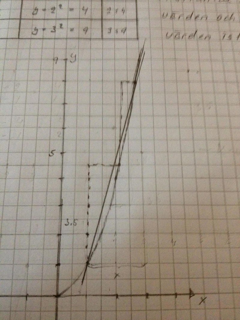 Jag bör göra en tabell och rita sedan. Egentligen behövs ingen tabell. Bara man skriver av koordinaterna och sätta sekant dit. Det där är exponentionell funktion om jag nu minns rätt eftersom det står y= x^ 2