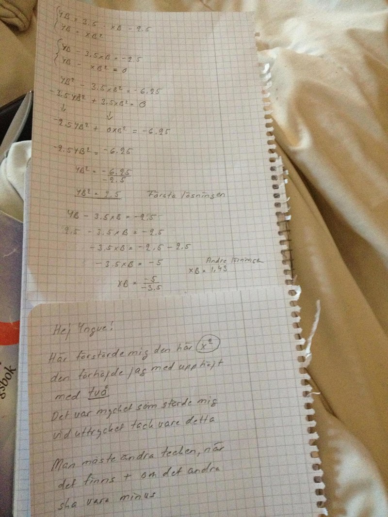 Först förstod jag att det här handlar om ekvationssystemet. Sedan lade Magdalena likhets tecknet både VL= HL och tillslut fattade jag att det här har med andragrads ekvation att göra med. Då satte jag gång med det.