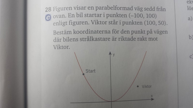 Vad ska gälla (i en viss punkt på parabeln) för att bilens strålkastare ska vara riktade rakt mot Viktor?