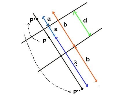 Påstående: Avståndet mellan startpunkt och slutpunkt är alltid 2d, det vill säga dubbelt så långt som mellan linjerna, oavsett var punkten ligger.