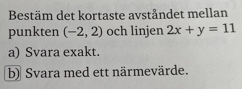 Du har den givna punkten (-2,2) och riktningskoefficienten för normalen ges genom ekv kk1 =-1 där k1 = den givna linjens riktningskoeff. = -2. Normalens rikt.koeff. k = (-1)/(-2)= 0,5 och dess ekv. är på formen y=kx+m =0,5x+m. Eftersom (-2,2) ska ligga på denna linje måste 2=0,5*(-2)+ +m =-1+m som ger m=3. Normalens ekv är därför y= 0,5x+3, Skärningspunkten fås genom att sätta denna i system med den givna ekv. och lösa detta. Med y=0,5x+3 insatt i den givna ekv fås 2x+(0,5x+3) =11 som ger 2,5x=8 dvs x=8/2,5=16/5 som ger y = 0,5*16/5+3 = 23/5 Avståndsformeln ger d2 =( (-2) -(16/5) )2 +(2-23/5)2 =(-26/5)2 +(-16/5)2 varur d erhålls som ovan givet rätt svar.