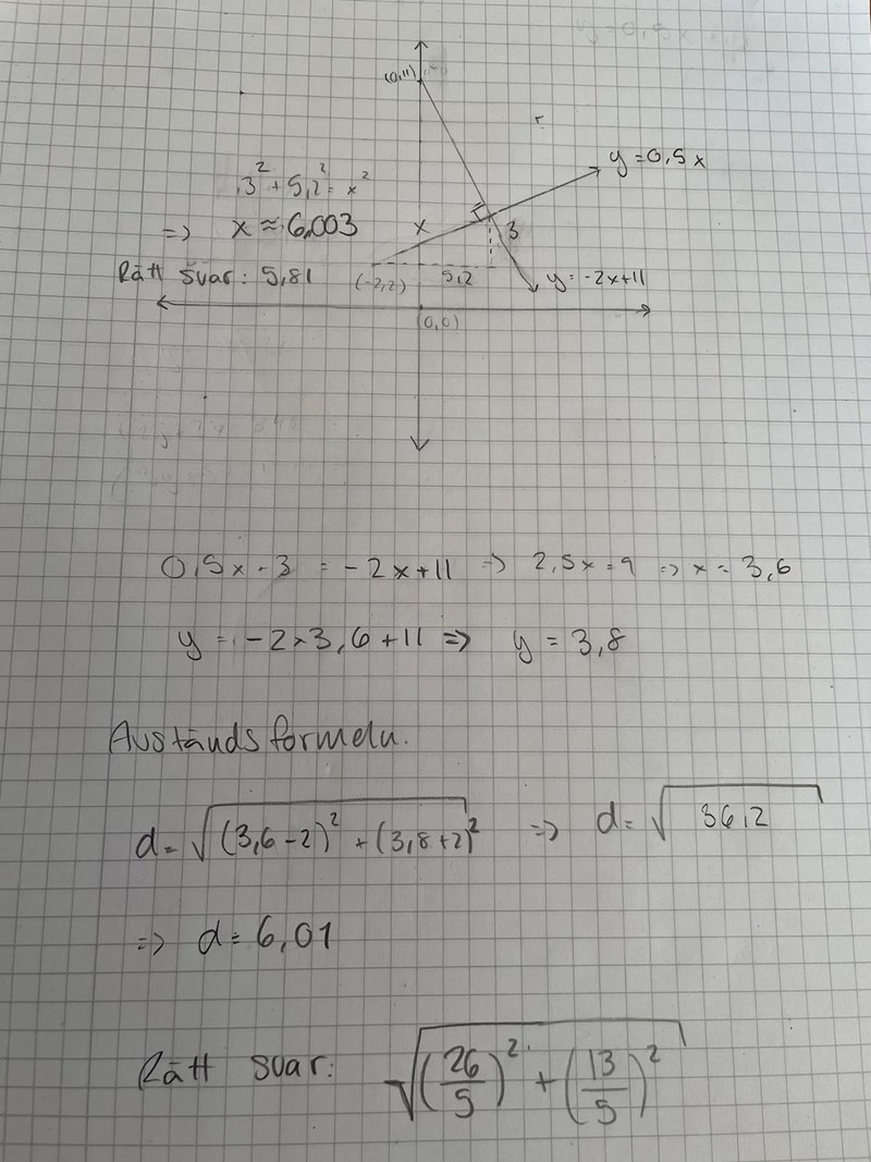 Din fråga gäller den algebraiska lösningen. Det ser ut som att du vet vad du ska göra. För säkerhets skull skriver jag ut det nedan. Du har ett räknefel två rader ovanför raden med "Avståndsformeln": 11-3 =8 inte 9 som du skriver. Det kan ha ställt till det för dig. Nu skriver jag ut lösningen: