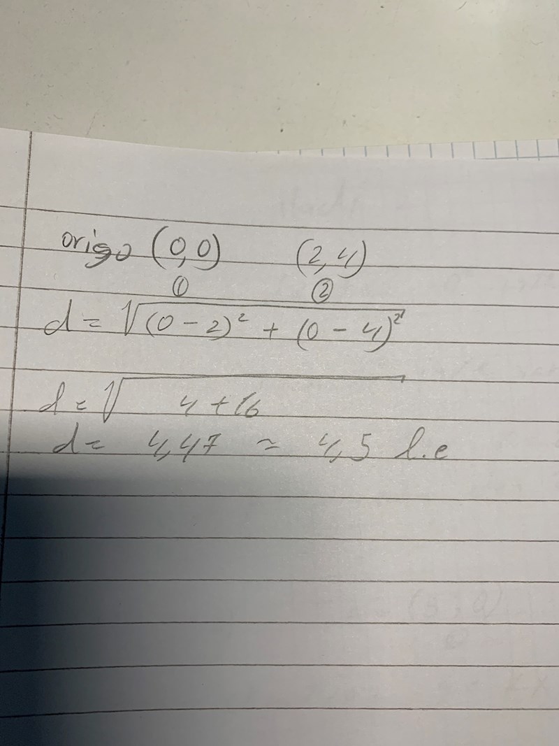 Det stämmer att avståndet mellan origo och punkten (2, 4) är d=20d=\sqrt{20} l.e. Behåll detta exakta värde istället för att avrunda.