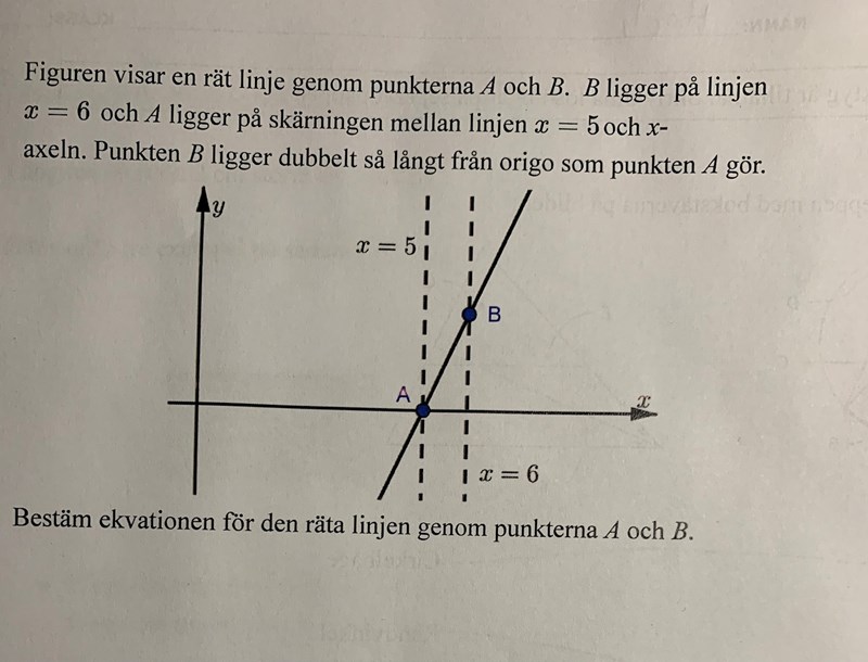 Den här uppgiften förstår jag inte! Hur bestämmer man y? Och hur kan jag använda informationen om att de ena punkten ligger dubbelt så långt från origo? Och även om jag får linjerna hur ska jag bestämmma räta linjen. Ska jag bestämma K och sen M?
