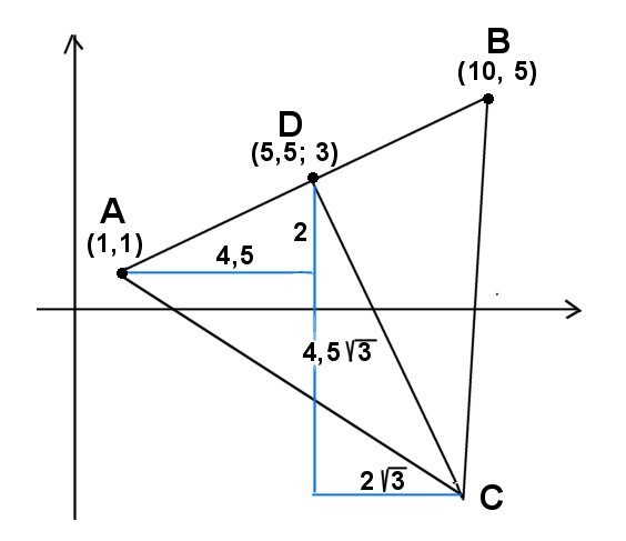 Det finns en fräga som jag hanterar med och kan inte lista ut det. Jag skulle vara tacksam om någon kan hjälpa med med någon form av lösning. Jag har koordinaterna för 2 punkter och måste beräkna och få koordinaterna för den tredje punkten så att dessa tre punkter bildar en liksidig triangel. A(1,1) B(10,5)