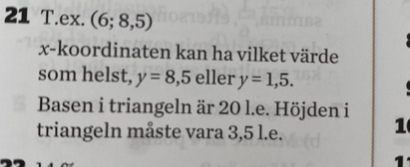 hej! Skulle verkligen behöva hjälp med en uppgift. När jag testade lösa den ritade jag ut ett kordinatsystem och försökte hitta alla möjliga positioner för att det skall bli en triangel. Några av mina exempel låg på (-4, 13) och (-4,-9). Inget av detta stämmer dock. När jag kollade facit blev jag ännu mer förvirrad .