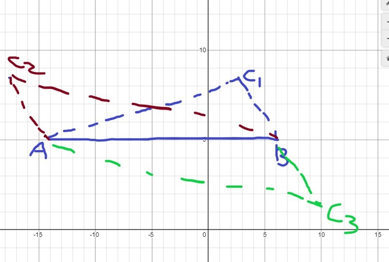 Här demonstrerar jag tre potentiell punkt C (två uppifrån basen och en ner). Vi vet höjden så C bara kan ha y-koordinaten 3,5 upp eller 3,5 ner, dvs 8,5 eller 1,5. Men vi vet ingen av vinklarna A, B och C och därför vi vet inte rätt x-koordinaten. Vi kan skapa oändligt antal trianglar med bara två y-koordinaten av C (8,5 eller 1,5) och oändligt x-koordinated