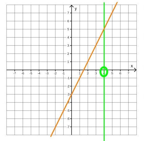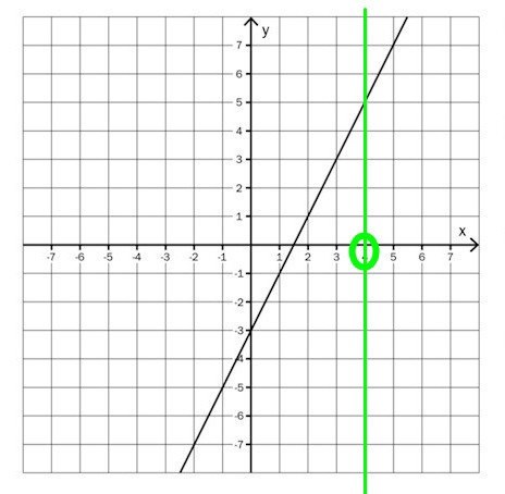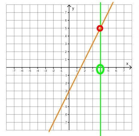 Just för räta linjer kan man nästan alltid räkna fram det andra värdet, men det går inte för lodräta och vågräta linjer. Titta på den gröna linjen: Om vi vet att x=4 kan vi ändå inte räkna fram y-värdet, därför att ALLA y-värden ligger på linjen.