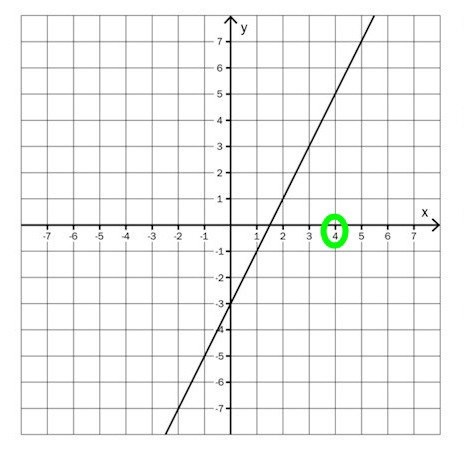Följ det lodräta strecket som går genom 4 på x-axeln. Se var det skär den sneda linjen. Vad är y där?