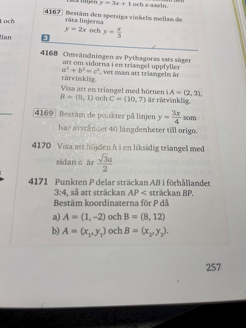 Förbind A och B och rita in punkten P på linjen. Skapa sedan rätvinkliga trianglar genom att dra en linje från A parallellt med x-axeln åt höger samt en linje från B parallellt med y-axeln nedåt. Då får du en rätvinklig triangel. Dra sedan linjer från P på motsvarande sätt och nu har du ytterligare trianglar i den stora.