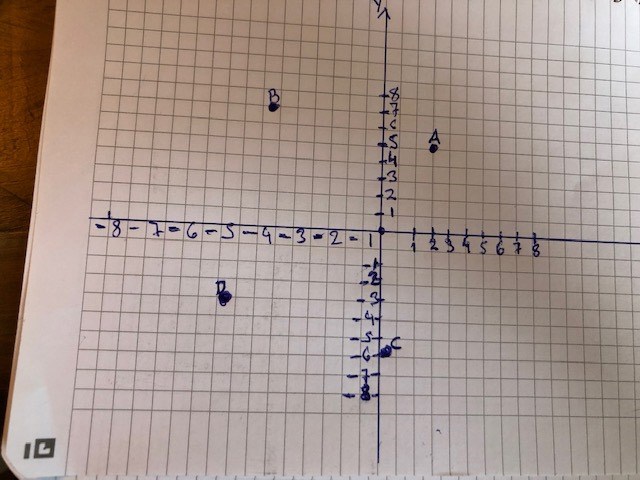 Punkterna är rätt men koordinatsystemet är inte helt rätt . Det första värdet på y-axeln (1) är tre ruter upp istället för 2 ruter. Sen är de negativa värdena på x-axeln -1 o.s.v. svåra att utläsa var de är. Gör som på samma sätt som för positiva x-värden ett litet sträck vid varannan ruta.