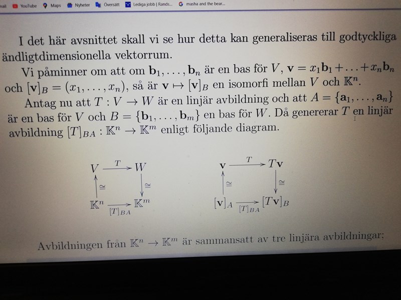 Och det är en inverterbar linjär avbildning, eftersom det är isomorfism. Men det jag egentligen fråger om är att vad behöver vi koordinatvektorn för. Till exempel vad betyder detta [v]B=(x1, x2,...., xn). Där B är basen, och xi är koordinater, och v är vektor.