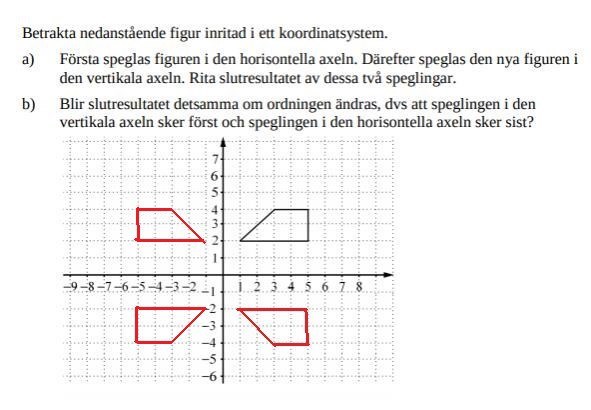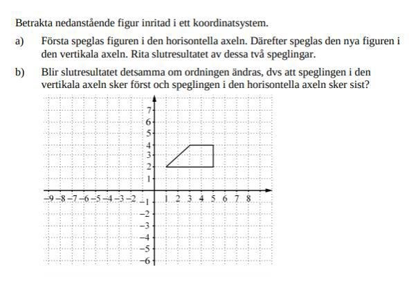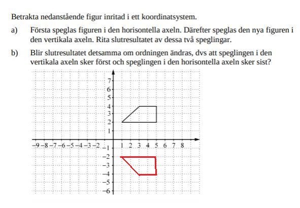 Laguna skrev:Jag testar först om du kan grundbegreppen. I figuren ingår hörnet (1,2). Var hamnar du om du speglar punkten (1,2) i x-axeln? Svaret är en punkt, som inte är (1,2).