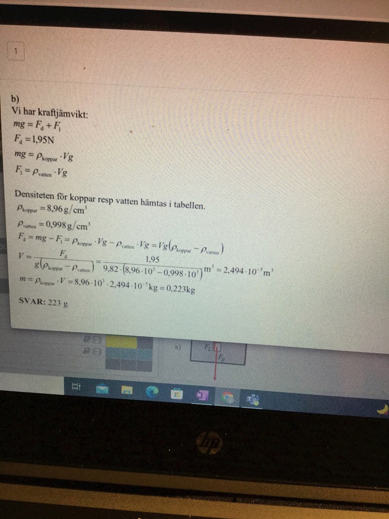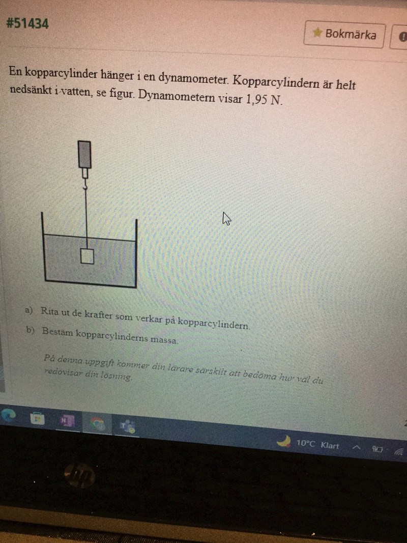 Hade den hängt i luft eller vacuum så hade 1.95N varit tyngdkraften. Vattnet ger en lyftkraft på kopparcylindern som samverkar med kraften från dynamometern.