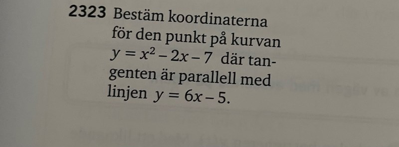 Tips: Linjen 6x+5, den har ju lutningen 6 (k-värdet). För att en annan tangent ska vara parallell med den måste den ha samma lutning (6). Hur kan du nu ta reda på vilken punkt för funktionen som har samma lutning?