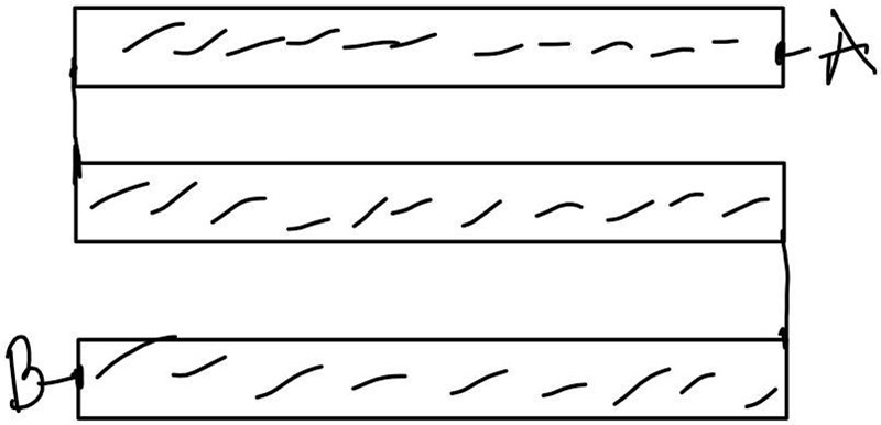 Jag tror att varje rött streck är en tråd med resistansen 5 ohm per meter. De är sedan parallellkopplade två och två. Resultatet blir ett schema som ser något sånt här: